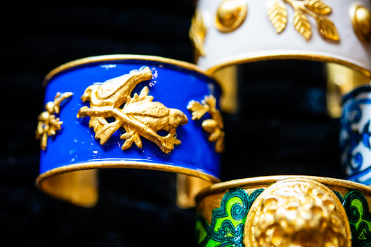 Gold and Cobalt Blue Birds / Branch Cuff Bracelet