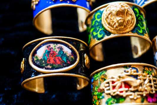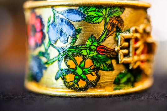 Gold and Multi-Colored Botanical Floral / Bird Cuff Bracelet